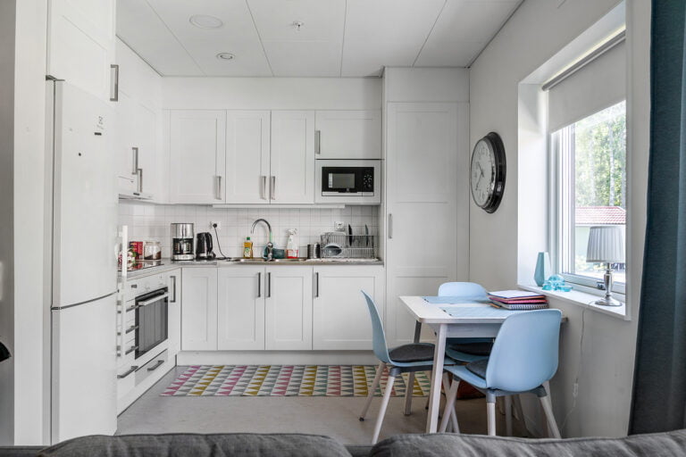 Boendet är en nybyggd, tillänglighetsanpassad villa med sex lägenheter. Du bor i din egen lägenhet som är 42 kvadratmeter och har en öppen planlösning med tydlig avgränsning mellan sovrum, vardagsrum och kök. Lägenheterna har egna badrum med dusch och toalett samt utgång till egen uteplats. Utöver lägenheterna finns även gemensamma ytor bestående av allrum och kök samt en gemensam uteplats och trädgård.